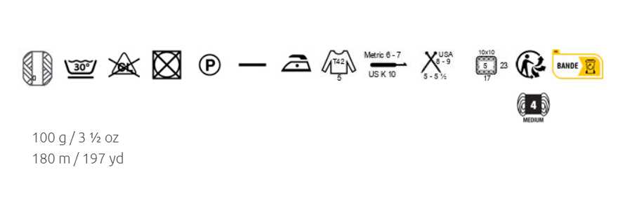 • Échantillon 10x10cm avec aiguilles n° 5 = 17 mailles sur 23 rangs