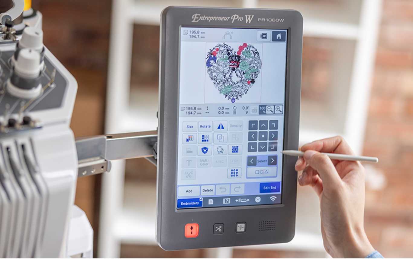 Simplicité d'utilisation, rapidité, Broderie multi-aiguilles, larges motifs caractérisent la Brodeuse Professionnelle Brother PR1050X.